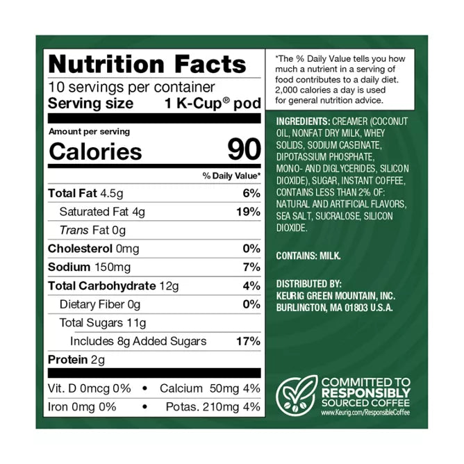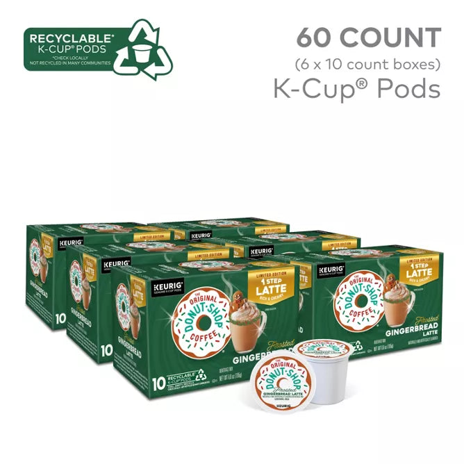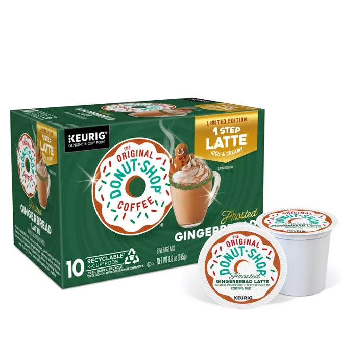 Treat yourself to the merriest of mugs with The Original Donut Shop® Frosted Gingerbread Latte K-Cup® pods with just the push of a button. When they sang “have a cup of cheer,” they were talking about this coffee, overflowing with the flavors of fresh-baked gingerbread, warming spices, and the sweetness of festively frosted icing. So rich, so creamy. And now — so easy! The Original Donut Shop® One Step Latte K-Cup® pods are filled with everything you need to make the perfect latte — coffee, flavoring, and sweetener — all in one! No creamer needed. Just brew on the 10 oz setting and enjoy! Or for an even richer, more indulgent experience, brew on the 8 oz setting. Each K-Cup® pod brews a perfect, great-tasting cup of coffee every time so you can enjoy the craveable creaminess of your favorite latte, made right when you want it, at the touch of a button. These K-Cup® pods are compatible with all Keurig® single serve coffee makers and brew up to 10 oz each. Simple. Delicious. And recyclable.* Enjoy the sa